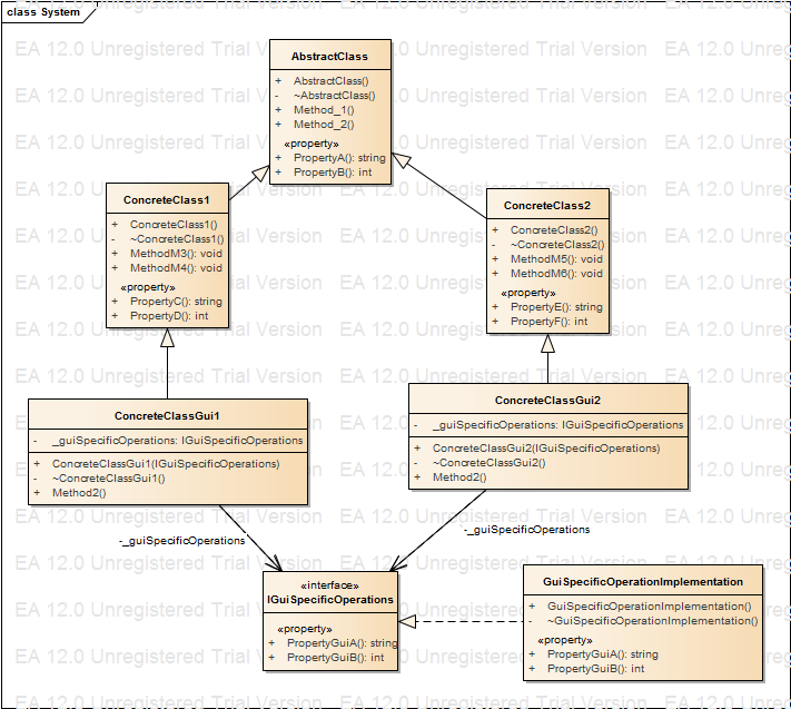 }还注意到,IGuiSpecificOperations的实现已经注入到ConcreteGuiClass中,而不是派生它们。