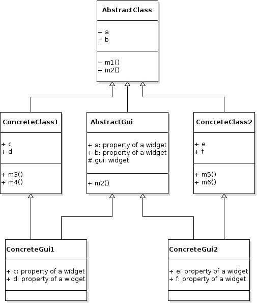 您不能同时从ConcreteClass和AbstractGUIClass派生,您可能必须将GUI实现保持分离并将它们注入ConcreteGuiClass中。