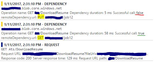 }从昨天起,我一直在Azure应用程序Insight中看到失败的依赖调用。不是错误,只是失败的依赖关系。每次下载文件时,都会执行GET请求,但同时也会出于某种原因执行PUT请求,结果失败。在下面的图像中,您可以看到这个错误的Insight日志。每个人看起来都一样。调用方法,下载文件,然后调用PUT请求.
