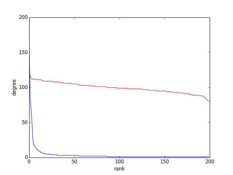 我认为显示无标度网络和随机网络之间区别的最直观的方法是绘制(排序/排序)节点度。