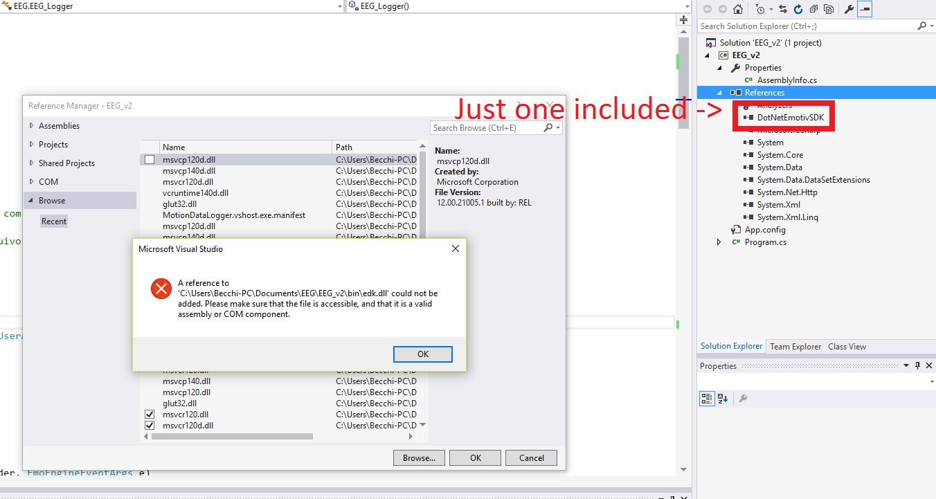 其次,您可以在github上找到Emotiv,还有一个示例解决方案,包含几个项目:https://github.com/Emotiv/community-sdk/tree/master/examples/C%23。您将注意到,这些项目引用了DotNetEmotivSDK项目,因此这将是解决问题的另一种选择。