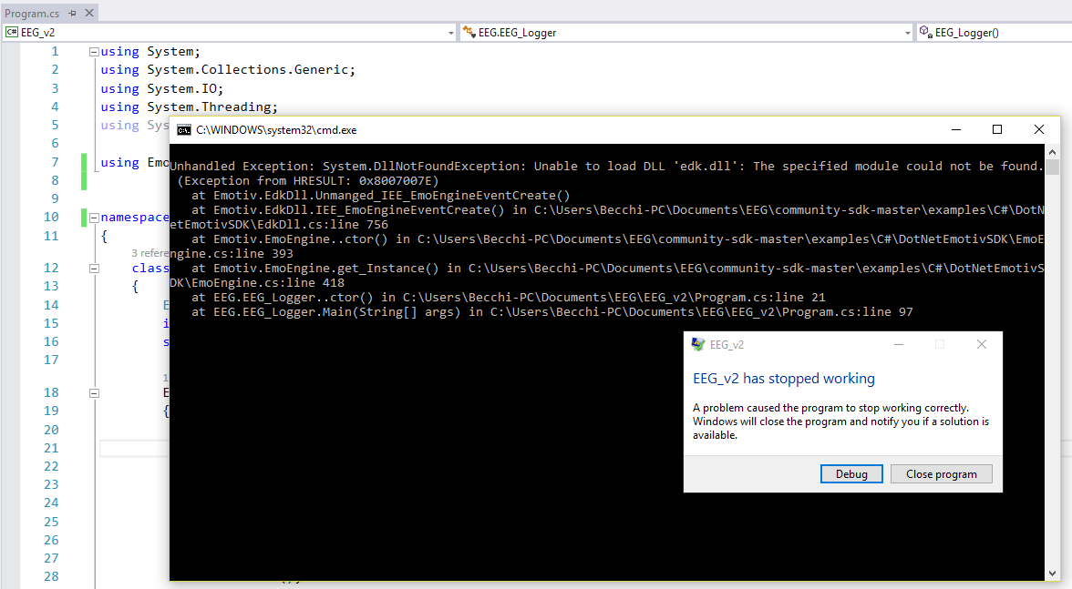 未处理的异常: System.DllNotFoundException:无法加载DLL 'edk.dll':找不到指定的模块。(除HRESULT: 0x8007007E外)在Emotiv.EdkDll.Unmanged_IEE_EmoEngineEventCreate() at Emotiv.EdkDll.IEE_EmoEngineEventCreate() at Emotiv.EdkDll.IEE_EmoEngineEventCreate 756 at Emotiv.EmoEngine..ctor()在C:\Users\Becchi-PC\Documents\EEG\community-sdk-master\examples\C#\DotNetEmotivSDK\EmoEngine.cs:line 393 at Emotiv.EmoEngine.getC:\Users\Becchi-PC\Documents\EEG\community-sdk-master\examples\C#\DotNetEmotivSDK\EmoEngine.cs:line 418 at C:\Users\Becchi-PC\Documents\EEG\EEG_v2\Program.cs:line 21 at EEG.EEG_Logger.Main(String[] args)中的_Instance()