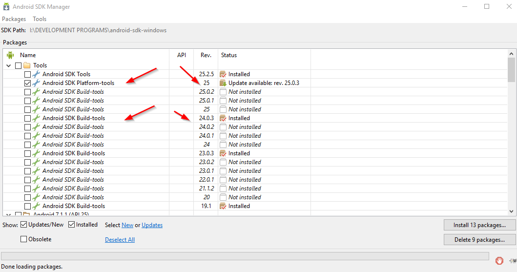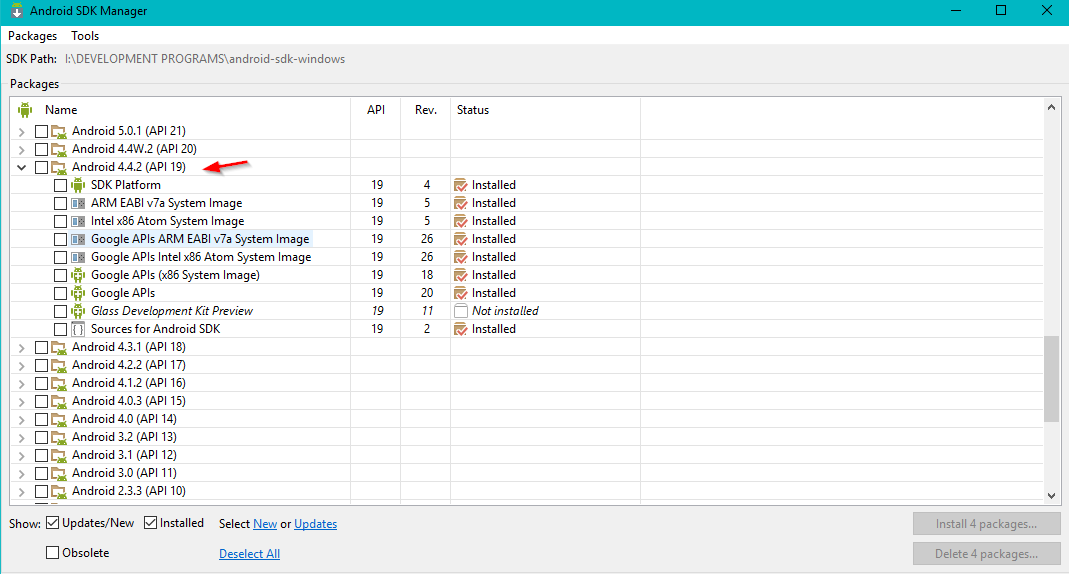 假设我想为API级别19构建我的应用程序。我需要安装什么级别的平台工具和构建工具。
