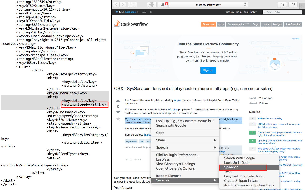 出于某些原因,尽管我的Info.plist NSServices属性似乎是正确的,但我的自定义菜单并不出现在所有的应用程序中,但在少数应用程序中可用。