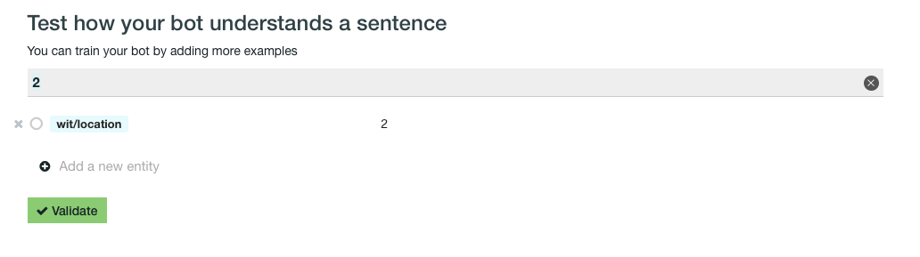 此外,您可能会意外地使用wit/location实体验证某些数字,使用wit/numbers实体提供一些数字。wit.ai不知道任何关于数字、位置等的信息,除非你先验证它们。尝试在“理解”选项卡上写“阿姆斯特丹”,您将看到wit.ai无法将此文本分配给任何意图或位置实体,因为您还没有训练他的模式:)使用wit/location验证它。之后他就会知道..。