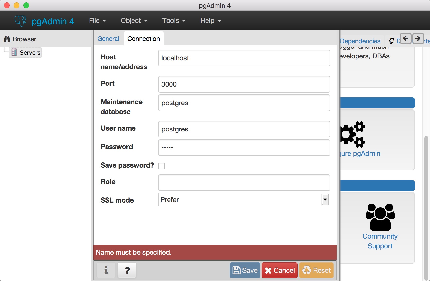 因为您没有为服务器指定名称,所以您正在收到错误,请单击"General“选项卡为您的服务器提供类似于"PostgreSQL9.6”的名称
