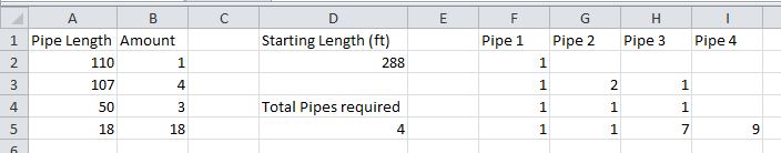 基本上,我需要什么样的公式才能做到这一点?基本上,这样我就可以输入零件的长度和数量以及棍子的长度,并计算所需的棒数。