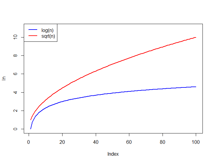 另外,比较下面函数的增长,对于所有的log n,log n总是以sqrt(n)为上限。