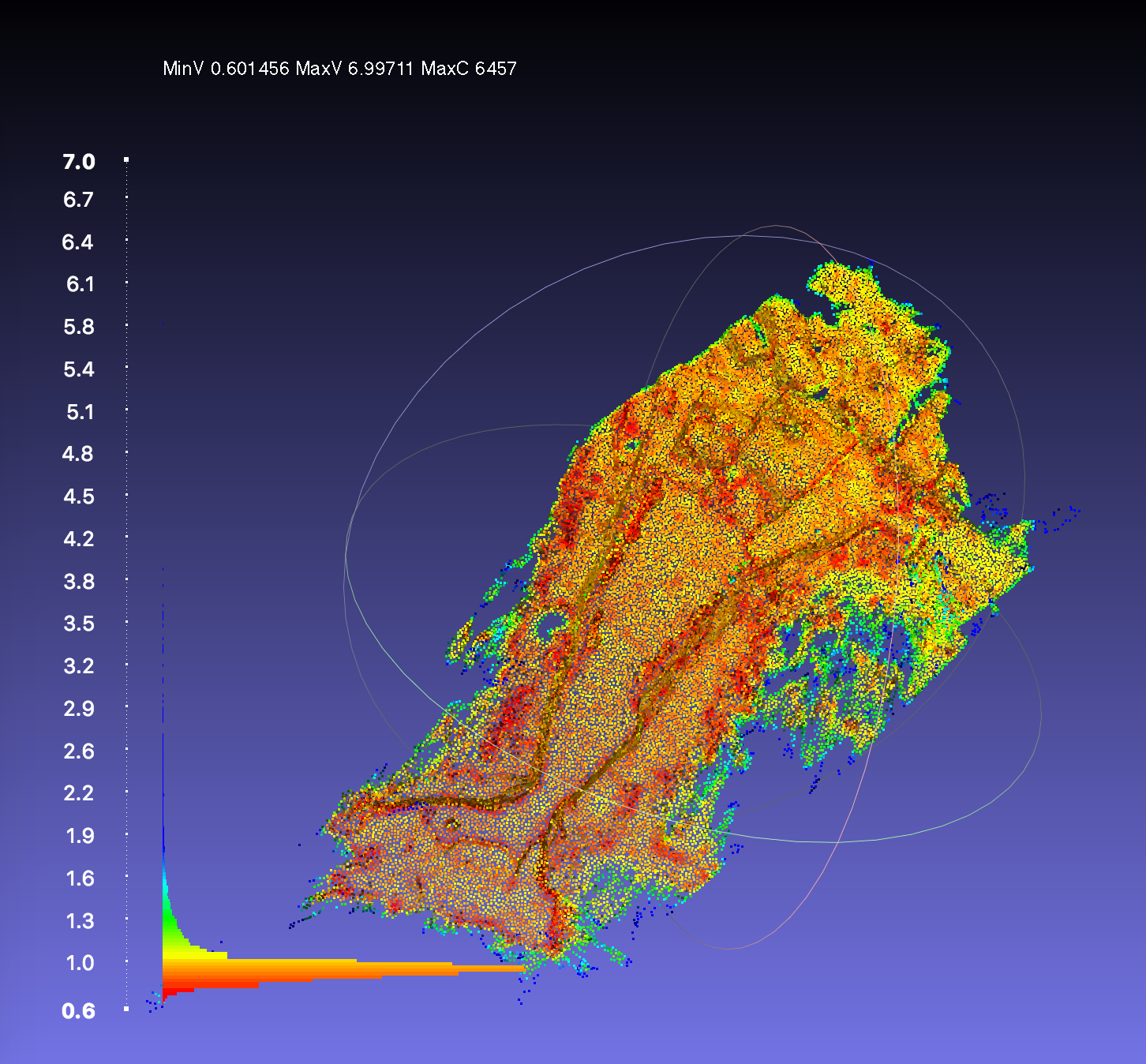 radius density”并选择第一个筛选器。这个过滤器为每个顶点计算一个值,这个值是'k‘最近邻的平均距离(默认k=16)。per vertex quality function‘并选择带有该名称的过滤器。在参数func中,只需键入'rad‘并检查'map into color’选项。这个过滤器将把刚刚计算出来的每个顶点的半径转换成质量,并将这个值映射到标准彩虹颜色图中。show quality hist‘并选择(再次:)该选项。在这一点上你应该得到一些类似的东西..。