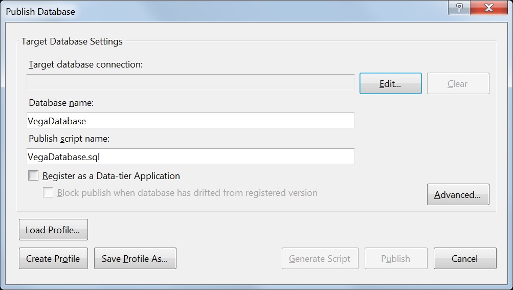 如果您只需要一个脚本,请将其指向本地实例上的某个新/虚拟数据库,并为其生成一个脚本。但是,最好定期将其指向数据库,并将其保存为项目中的发布配置文件,这样您就可以轻松地重用它。