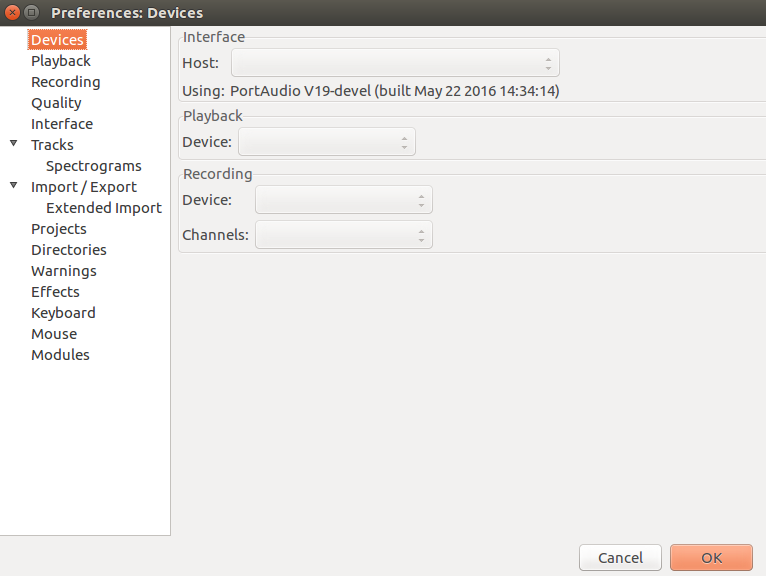 更新:我也不能看到任何声音设备上的奥迪,尽管事实是,他们出现在系统Settings>Sound。在Audacity中,我得到了一个错误: