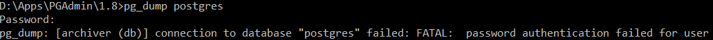 我试图直接使用pg_dump.exe,但它提示我输入密码。我尝试了我所有的密码--用户密码,服务器密码,我用这些密码连接到PGAdmin 4中的数据库,其他的密码,但似乎都不起作用。