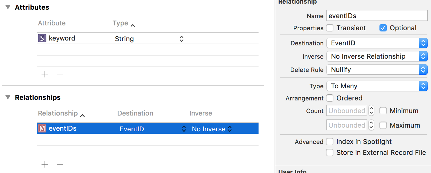 要做到这一点,您需要首先创建另一个名为EventID的实体。添加一个名为id的属性,并使其类型为Integer32。在此之后,通过单击“关系”部分中的"+“,创建一个从Entity2到EventID的"to多”关系--这类关系同时回答了第三个问题。这是一张你应该拥有的东西的图片: