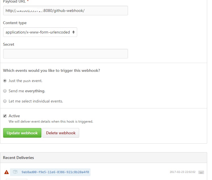 要么是防火墙阻塞了,要么是您必须检查WebHook是否在存储库->设置-> WebHooks中启用。有一个很好的导游这里。使用RequestBin进行测试,以确保这不是服务器端的问题:)