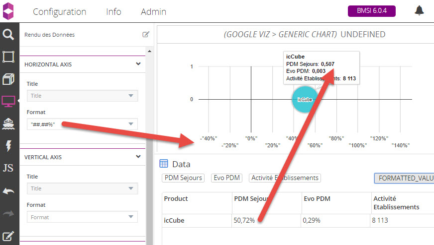 使用V6报告,我创建了一个具有简单百分比值的气泡图。我可以使用它的" format“属性来格式化轴值。但在气泡工具提示中,这个值仍然是原始值.是否有一种方法来显示格式化的值而不是值?