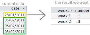 我们的表中有一列,它以“日期”类型存储了许多记录,我们希望每周将它们分开,并找到我们专栏中每周重复的次数。数据库在甲骨文中。我认为要创建一个动态别名,我们需要游标。下面的图片可能会有所帮助:
