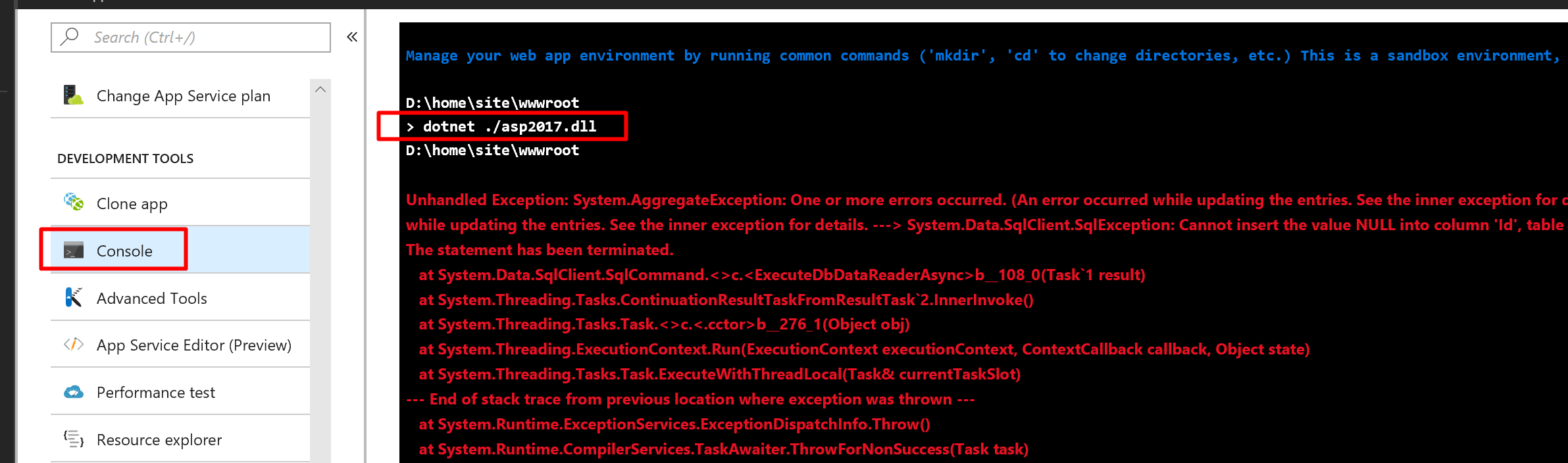 目前,有一种简单的方法可以查看实际错误是什么。打开app服务中的Console部分,然后尝试运行dotnet应用程序。从那里我们可以得到完整的错误消息和跟踪信息: