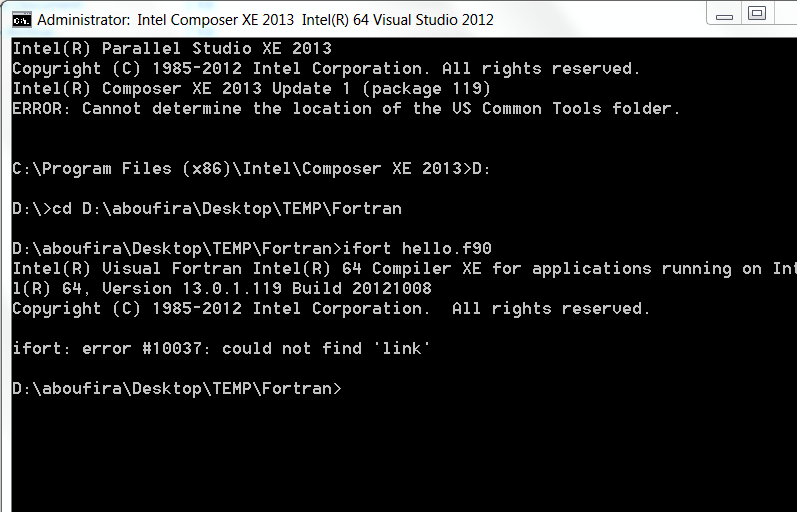 针对Steve的回答,下面是我使用Intel Fortran命令提示符运行的几条命令。正如你所看到的,问题依然存在。