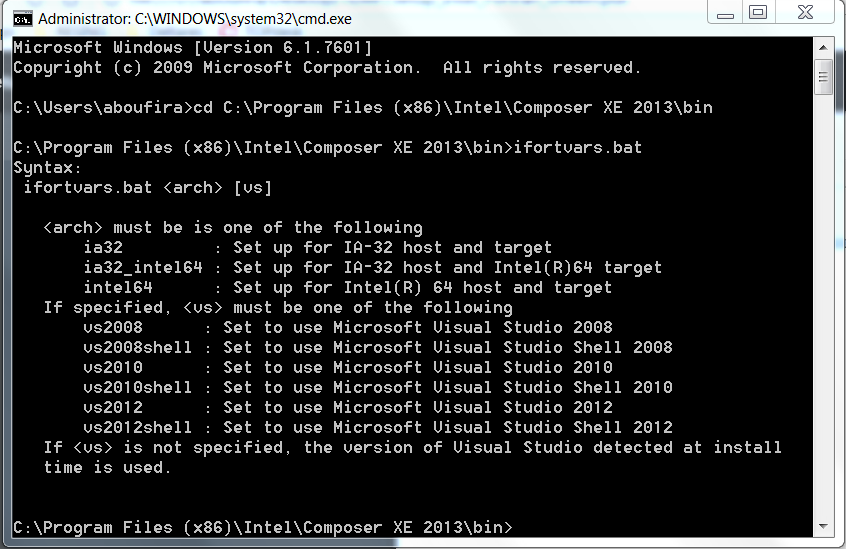 我只是在windows中运行ifortvars.bat,仍然得到相同的错误。请参阅下面的ifortvars输出。