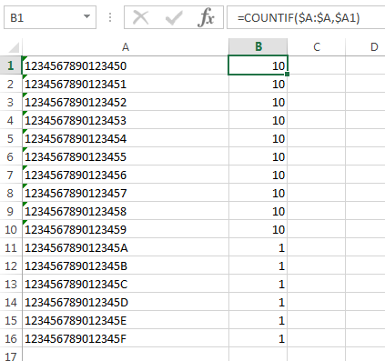 正如您在该示例中所看到的,可以转换为整数的16位数字的值由它们的前15位有效数字进行比较,因此,似乎列中每一位都出现了10次,而COUNTIF()正确地将具有字母的字符串计算为列中的唯一值。