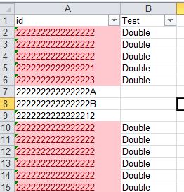 我有一个带有ID和数据的Excel列表(大约8000行或更多)。ID只能是带有字符的数字。类似于"2222222222222223“或"222222222222222A”(带有ID的单元格被格式化为文本)