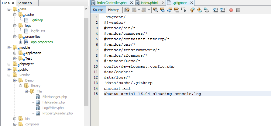 我有NetBeans8.2,正如您所看到的,在我的项目中有两个文件被正确忽略,这些文件是".gitkeep“和"app.properties”。但是,我想从忽略所有文件中排除/ see /Demo/librery/File目录下的所有文件,但是我必须做一些错误的事情,因为我看不到它们的变化。
