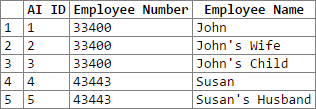 CREATE TABLE yourTable (`AI_ID` int, `Employee_Number` int, `Employee_Name` varchar(255));