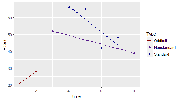 test.plot <- ggplot(df, aes(y = votes, x = time, colour = type)) +
