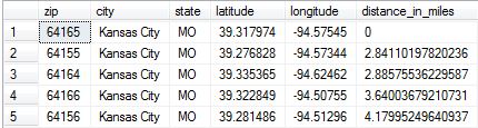 SELECT TOP 5 zip, city, state, latitude, longitude,