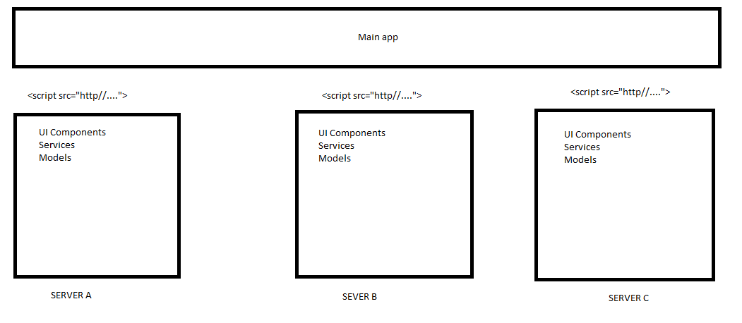 我想让我的应用程序从独立服务器(A,B,C)的整体应用程序中加载不同的组件,这样它们就可以从主应用程序中独立地被删除和更新,并且包含在A、B或C中的任何组件都不会被加载。底部显示的3个模块将包含组件,但主应用程序将在其HTML中声明应该加载组件的位置。