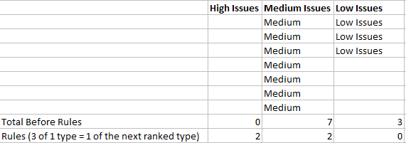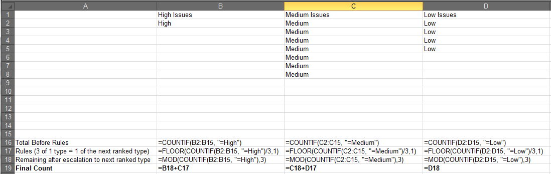所以我在Excel中有3列。每一栏(A/B/C)都包含“高”/“中”/“低”得分问题。然而,如果您有3个低发行,这是分组在一起,这成为一个中等发行,例如。