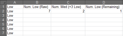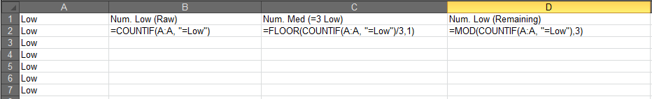 我所需要的是一个公式,即“如果你有7种低发行量,(3种低=1种),那么你就有2种中等和1种低),然后将中等发行加到中等发行栏(Col B),其余的低发行量计算在低发行量栏(Col C)。