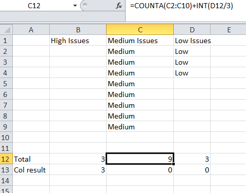 =COUNTA(C2:C10)+INT(D12/3)