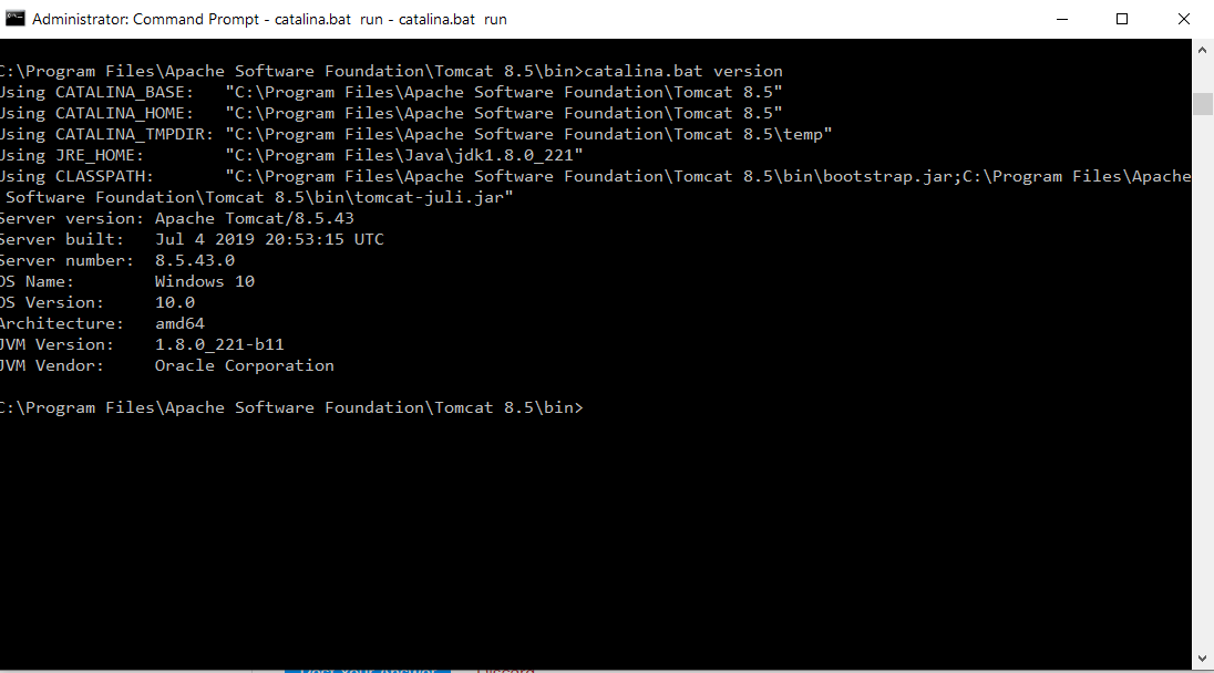 C:\Program Files\Apache Software Foundation\Tomcat 8.5\bin>catalina.sh version