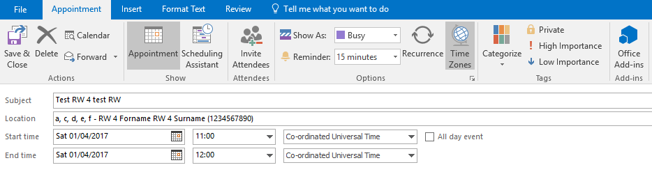 请注意,约会显示通过Office365Online- https://outlook.office.com/owa/查看时的正确时间。