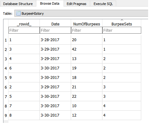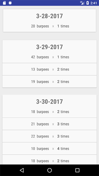 SELECT DISTINCT Date FROM BurpeeHistory然后,您需要按日期查询每张卡的记录。