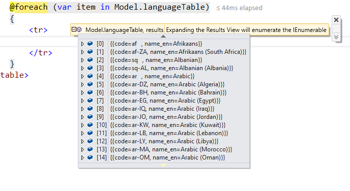 由于它们不是强类型的,所以我无法访问(并正确显示)对象code和name_en (请注意我使用动态linq的原因是列名因select而异)。我试图通过索引item[0], item[1]访问值,但是我得到了一个Cannot apply indexing with [] to an expression of type 'object'错误。