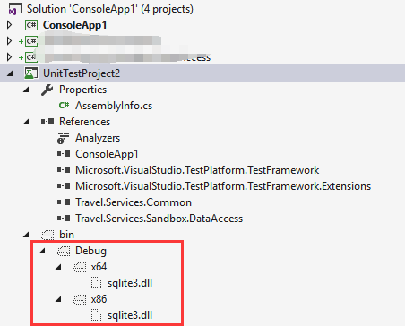 我在VisualStudio2017中尝试了POC,通过一个net461项目和一个单元测试项目,net461项目可以很好地与sqlite一起工作,但是单元测试项目需要参考sqlite封装,