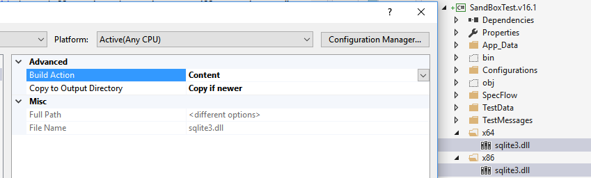 遍历是将x86/sqlite3.dll、x64/sqlite3.dll添加到项目中作为"Content“和”复制它更新“(否则,它可能被使用,并导致错误)如下所示