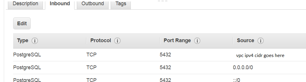 我正在开发一个应用程序,我想从AWS连接到postgresql数据库,我已经将具有公共访问属性的数据库设置为true.Inbound,出站策略如下