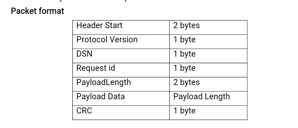 分组格式包含,在与TCP上的设备通信时,没有标识数据包之间的边界,在这种情况下,如果数据包不连续,或者如果有任何数据包丢失,就可以使用“报头开始”来识别新的数据包。因此,包中的前2个字节表示包的开始。