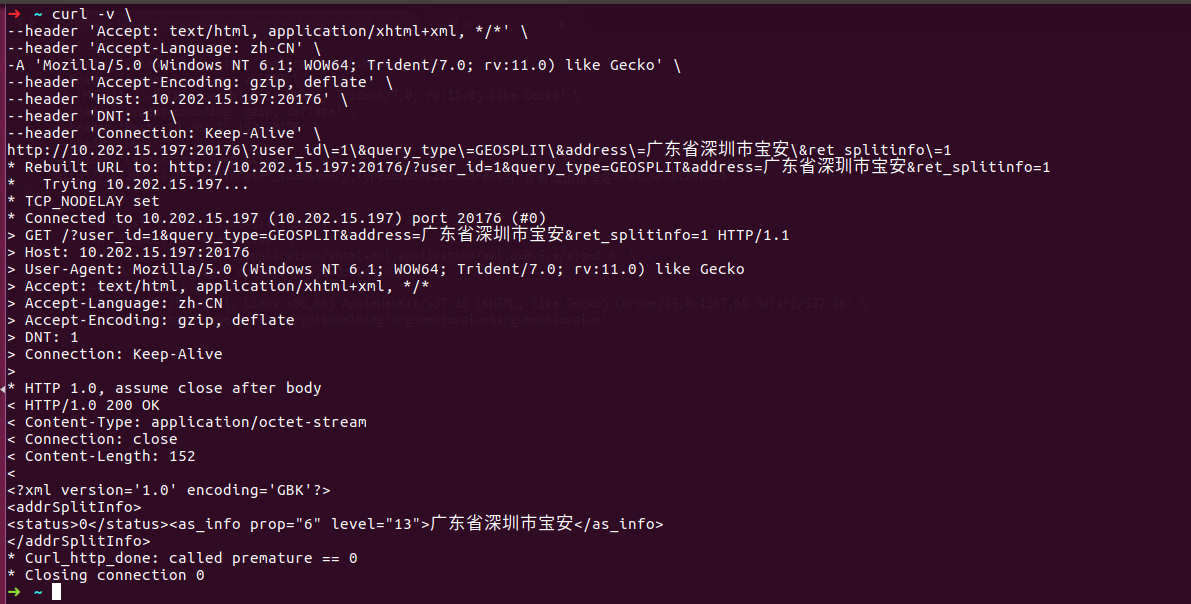 echo "http://10.202.15.197:20176\?user_id\=1\&query_type\=GEOSPLIT\&address\=广东省深圳市宝安\&ret_splitinfo\=1" | iconv -f utf-8 -t gbk | xargs curl用python-requests