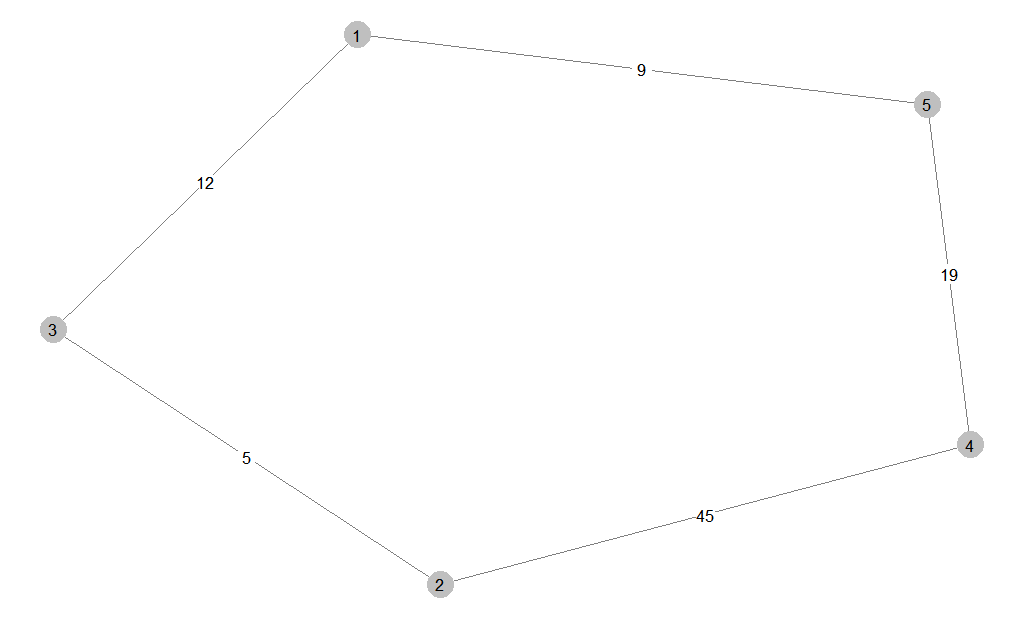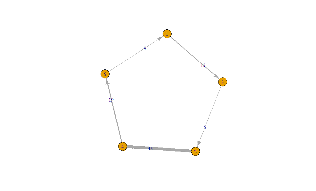 plot(g, edge.width = E(g)$weight/5, edge.label=E(g)$weight)