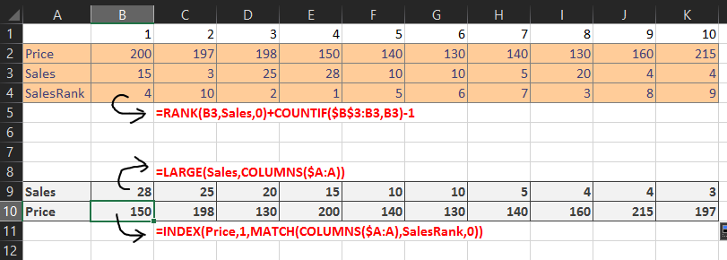 B10: =INDEX(Price,1,MATCH(COLUMNS($A:A),SalesRank,0))