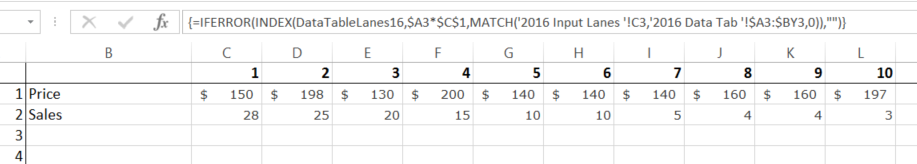 这个公式与销售价格相匹配。这就是我遇到问题的地方,=IFERROR(INDEX(DataTableLanes16,$A3*$C$1,MATCH('2016 Input Lanes '!C3,'2016 Data Tab '!$A3:$BY3,0)),"")
