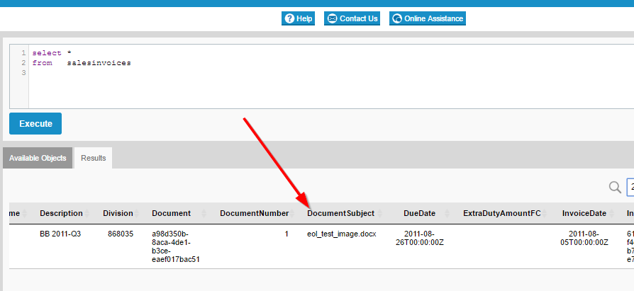 见图。文档DocumentNumber和DocumentSubject可以在ExactOnlineREST..SalesInvoices中获得: