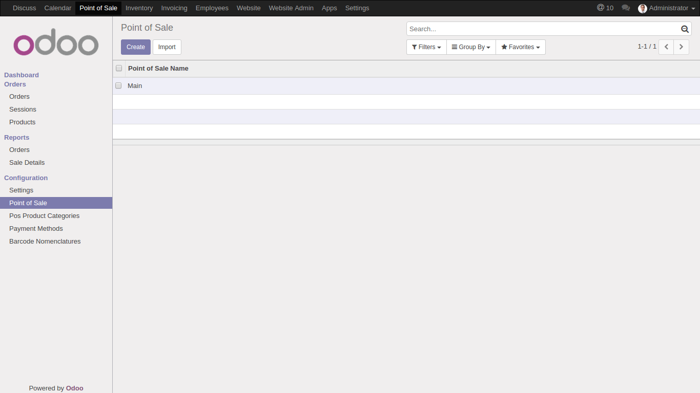 在odoo10中,我们还可以在POS中创建不同的会话。但是在这里,这个配置不在odoo8 & odoo9中。如图所示,这个特性在Point of Sale >> Configuraion >> Point of Sale下面,您可以看到"Create"按钮。在那里您可以创建多个会话。