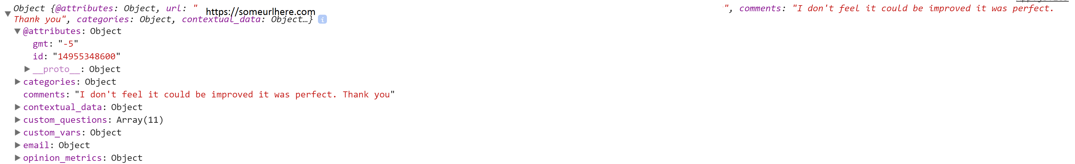 我获得了一些数据,这些数据将从API返回,并在PHP中转换为js对象,然后再传递回浏览器。我试图从这个对象中检索的一个值位于对象属性中。以下是JS中对象结构的样子: