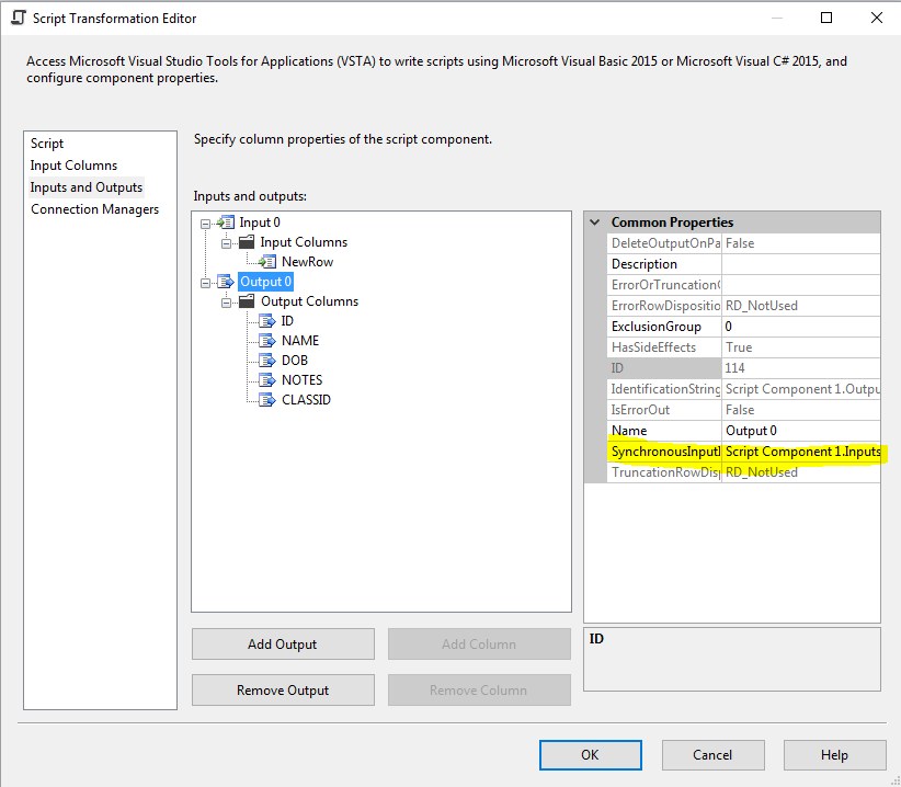 Flat File Source,2x Script Component,OLEDB DestinationColumn0标记为input,我将添加5个输出列ID,Name,DOB,Notes,ClassID,并将输出同步输入设置为None