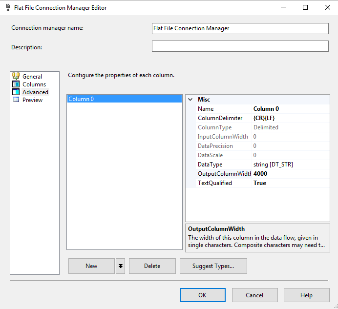 使用SSIS 2012。我的平面文件连接管理器有一个分隔文件,其中行分隔符设置为CRLF,但是当它处理该文件时,我有一个文本列,其中包含一个LF。这导致它将其读取为行结束符,导致其失败。有什么想法吗?
